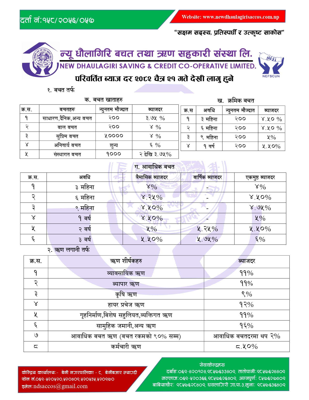 म्याग्दी जिल्लाको प्रथम बचत तथा ऋण सहकारी संस्थाका रुपमा यस संस्थाको स्थापना आज भन्दा २२ वर्ष अगाडी यो सहकारीको जन्म भएको हो । स्थापनाकालमा जम्मा २९ जना सदस्यहरुको रकम ७ लाख २५ हजारबाट आफ्नो कारोबार सञ्चालन गरेको यस संस्थाले यो २ दशकको अवधिमा लगभग ७ करोड ६९ लाख ६७ हजार पूँजी संकलन र ५,१७८ जना शेयर सदस्य गरी म्याग्दी जिल्लाका ४ वटा स्थानीय तहमा एवं पर्वत जिल्लाको १ वटा स्थानीय तहमा आफ्नो प्रत्यक्ष कारोवार ६ वटा सेवाकेन्द्र र २ वटा उपकेन्द्र मार्फत आफ्नो सेवा विस्तार गर्न सफल भएको छ ।