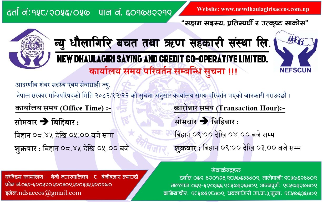 म्याग्दी, १९ पुस । म्याग्दीको सदरमुकाम बेनीमा रहेको न्यू धौलागिरि बचत तथा ऋण सहकारी संस्थाले शेयर सदस्यलाई विभिन्न सेवामा छुट उपलब्ध गराउन विभिन्न ६ ब्यावसायीक संस्थासंग सम्झौतामा गरेको छ। धौलागिरी सहकारीले शेयर सदस्यले लिने विभिन्न सेवामा चलनचल्तीको मूल्यमा थप छुट उप…